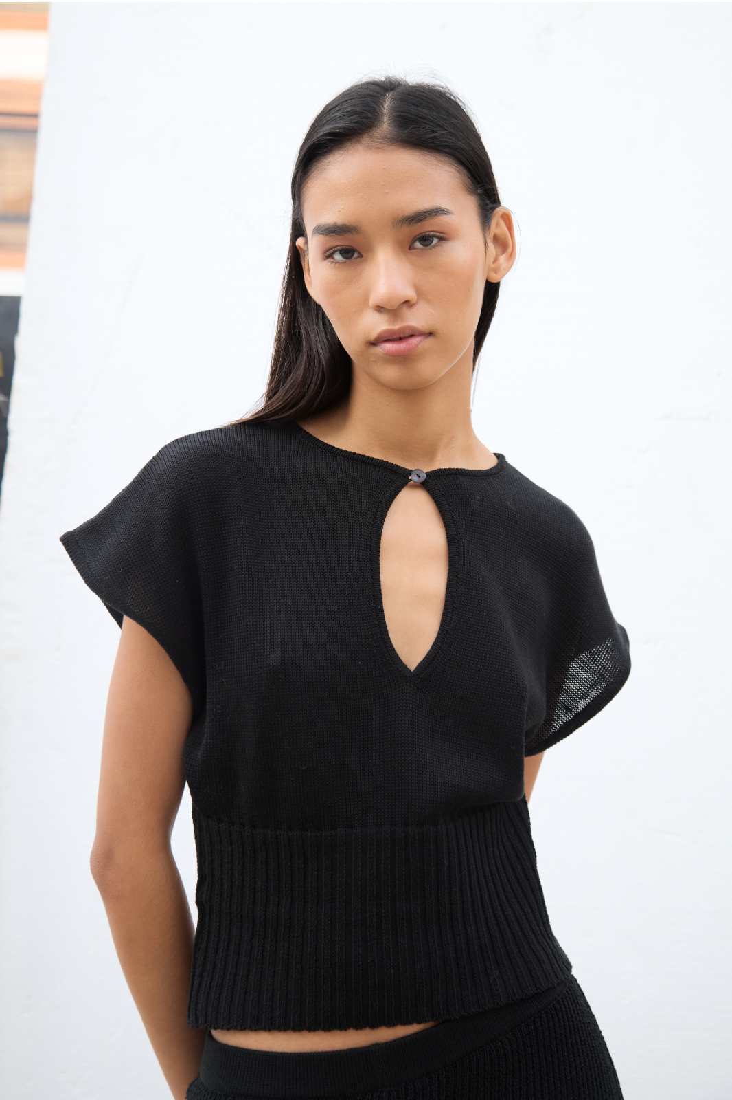 Top tejido en 100% algodón Pima, con tejido rib que se moldea al cuerpo y con diseño versátil para darle doble uso.